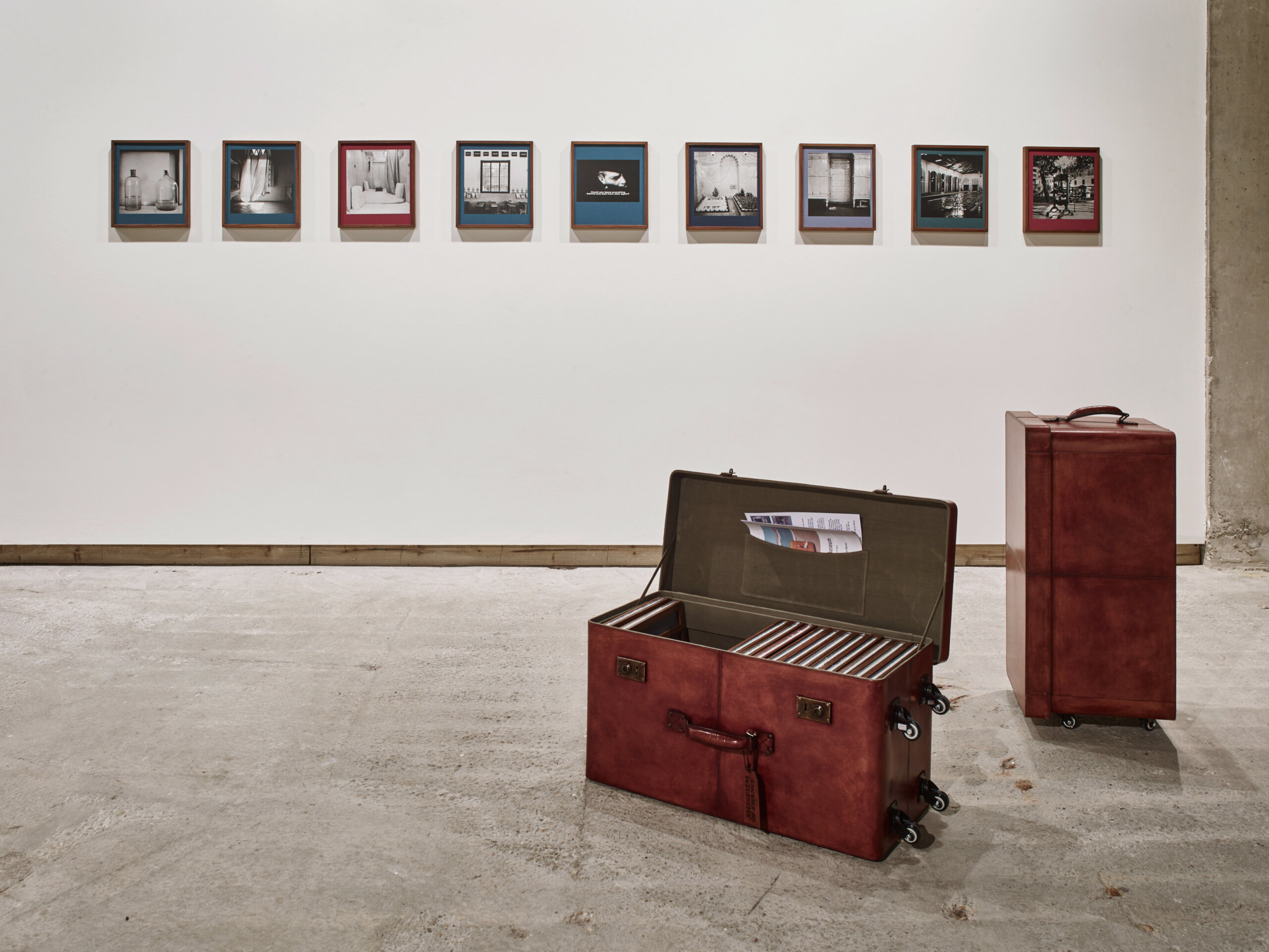 Over the following months, I became witness to Museum of Chance’s several journeys across form. I worked with Dayanita on the exhibition note for the book-objects’ very first showing in Mumbai and was present when she created the Museum of Chance book-case. I watched as she designed several iterations of the book-object canvas and leather tote bags, and personally oversaw the packing and shipping for Suitcase Museum’s voyage to its maiden exhibition. I accompanied Dayanita to her booths at the India Art Fair in Delhi and the Dhaka Art Summit, where I assisted her with the book-object edition sales. And, for the better part of three years, I worked under the watchful presence of eighty-eight Museum of Chance book-objects as they hung on the studio’s sliding Book Walls.