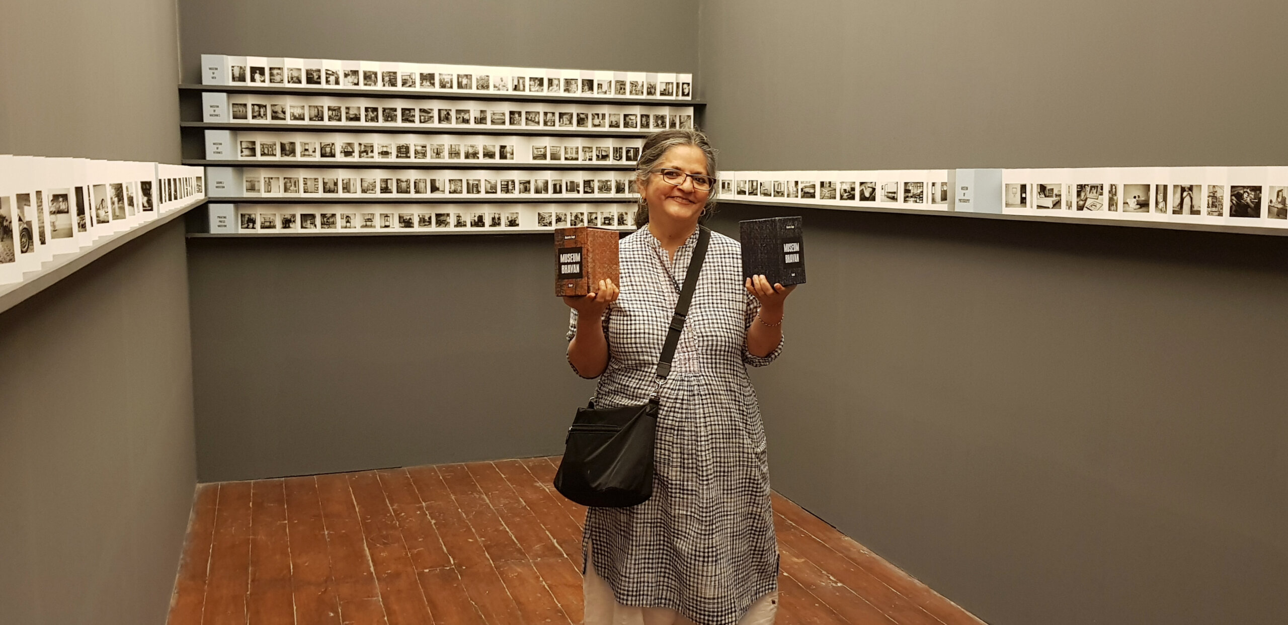 ‘Pocket Museum’ emerged out of Singh’s desire to perform the Museum Bhavan book. To do this, she designed a jacket with nine pockets, sized to fit one accordion-fold book each. On the back of the jacket, she had the words ‘MY LIFE AS A MUSEUM’ embroidered.