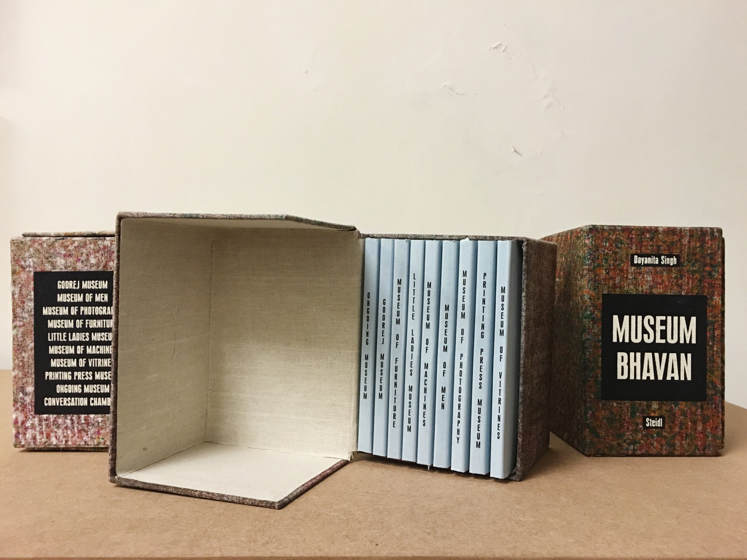 With nine accordion-fold volumes and a small booklet of two printed conversations, the Museum Bhavan book brings all of Singh’s large museums together in one box. Here, the accordion-fold form allows each volume to transform into an individual exhibition when it is unfurled and displayed standing on its side.