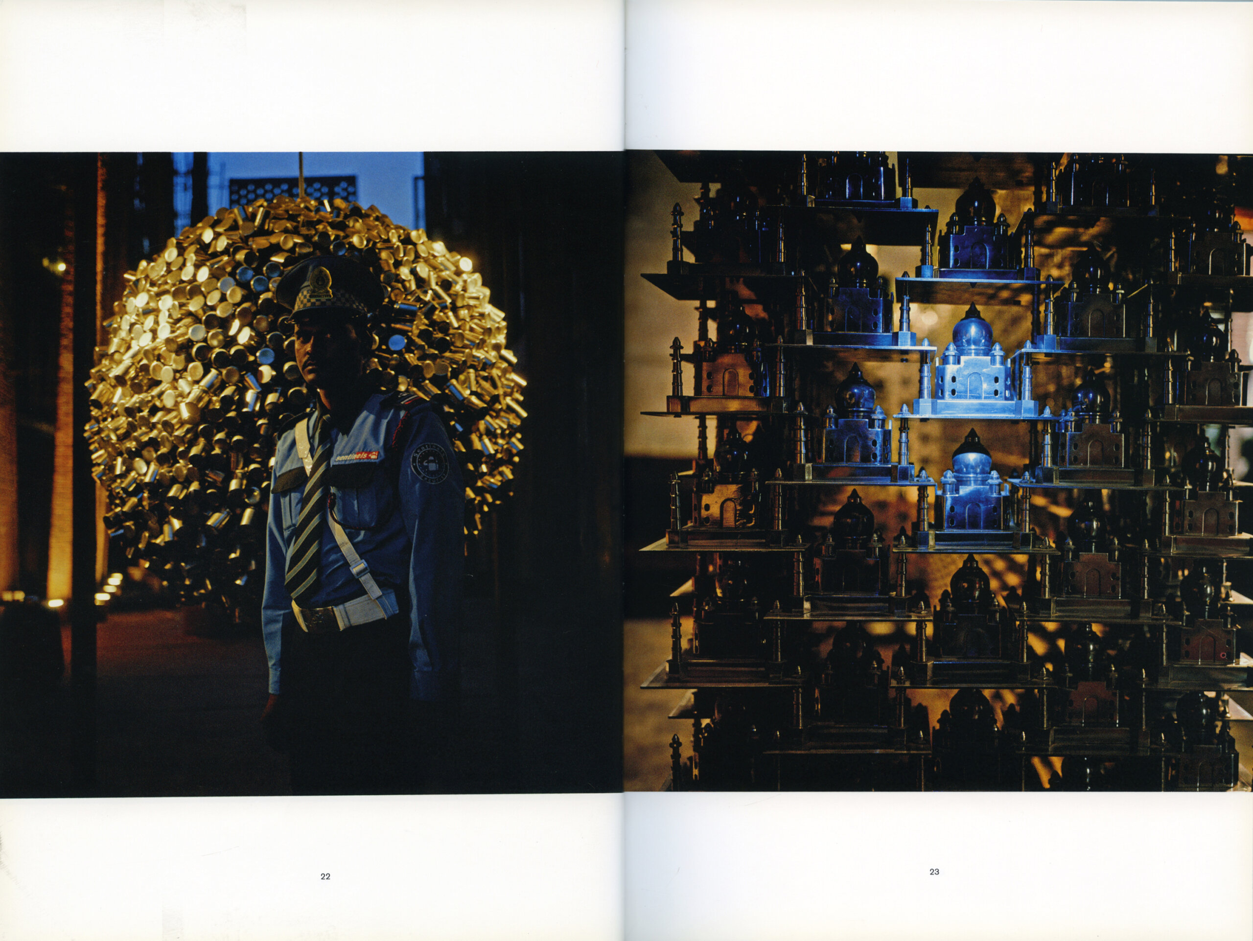 The book harbours many secrets. Even before you’ve opened it, it wears two mysterious clues. The first is a single unpunctuated sentence by Sen, repeated and wrapped around the dust jacket and endpapers like a slim ribbon: “the house of love is a house of illusions is a house of returns is a house of art is a house of death.” The second, concealed under the dust jacket on the book’s hard cover, is a close-up photograph of the artist Sudarshan Shetty’s sculpture ‘Taj Mahal’: a mammoth block of repeating miniature metal Taj Mahals, spotlighted in the image by an electric blue beam of torch light.
