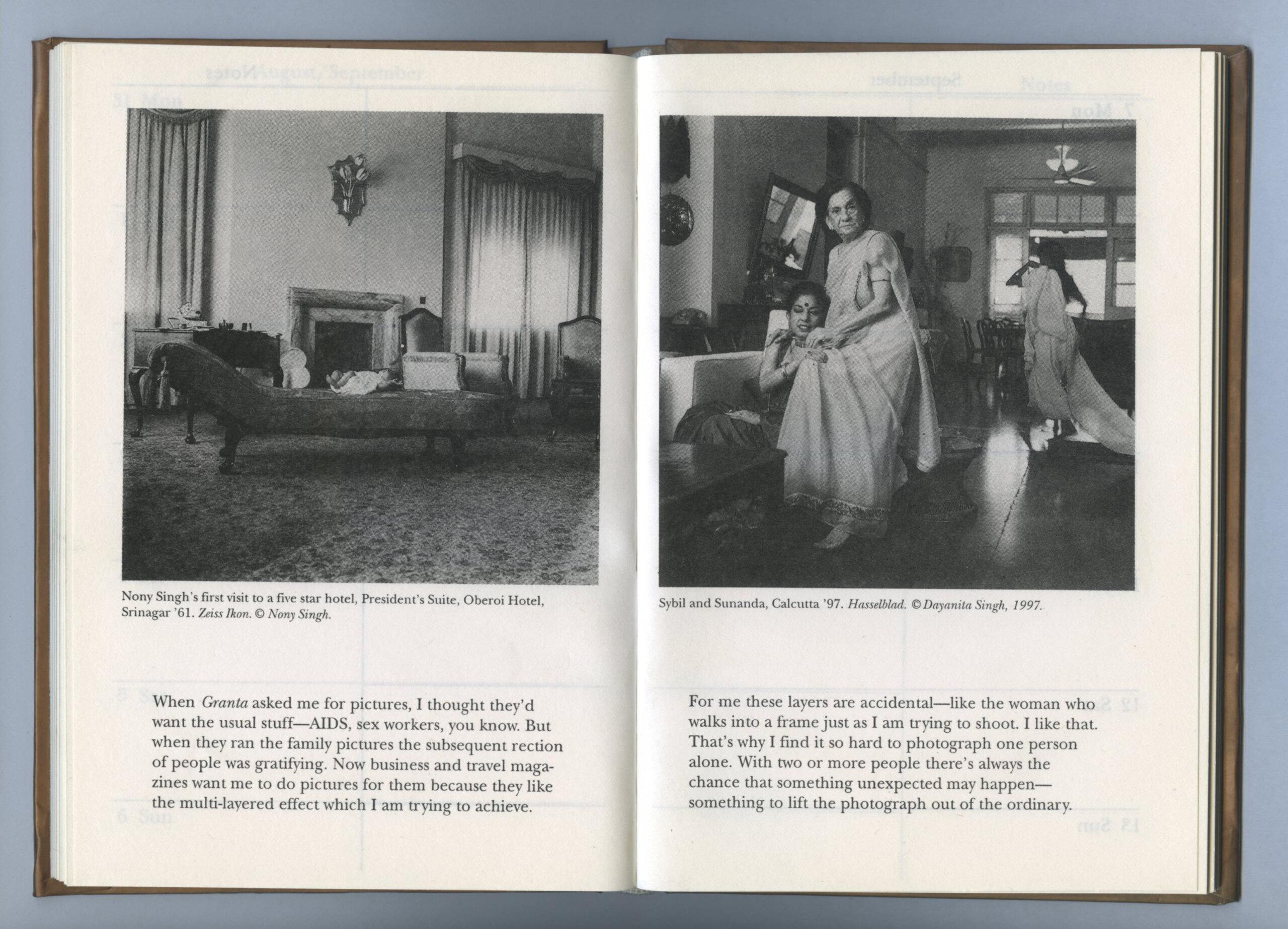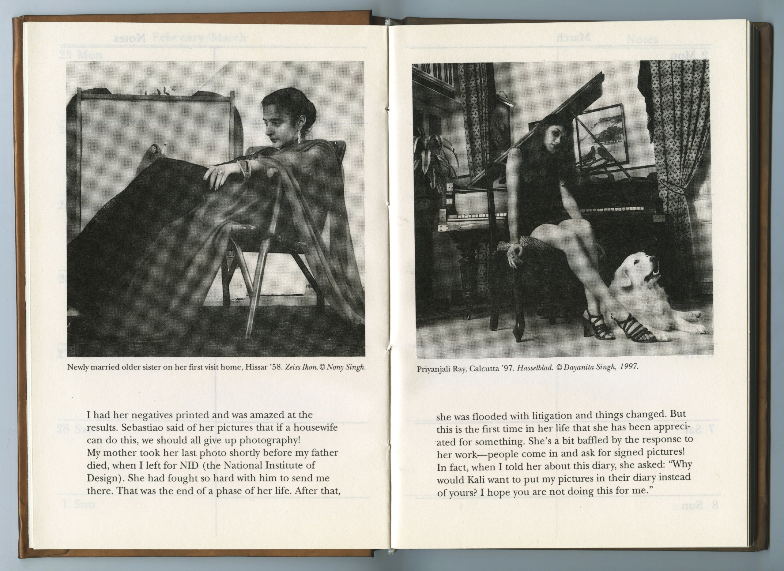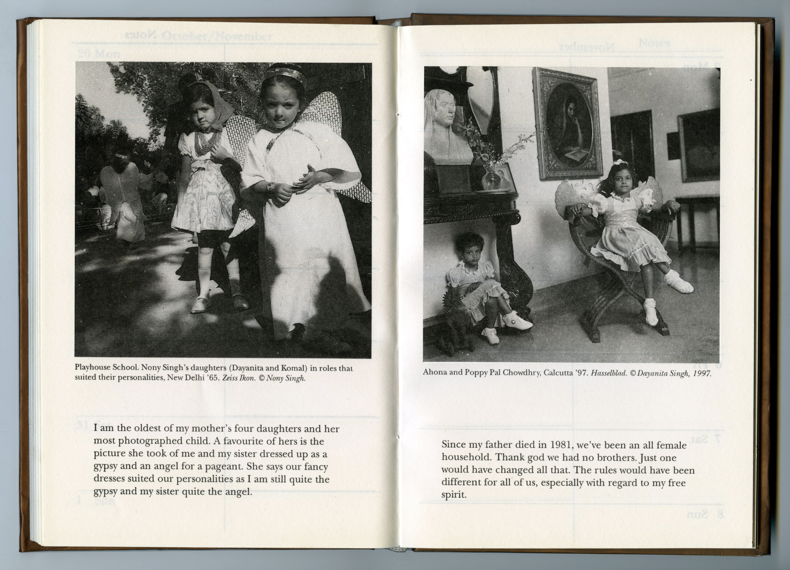 Inspired by these discoveries in similitude, Singh and the Kali publishers created an edit of 19 images that placed some of Singh’s family portraits alongside pictures that Nony Singh had made of her own family (often of Singh and her sister as children). Accompanying each photo was a detailed caption and backstory, lovingly written by Singh. Although the diary was not a book in the traditional sense, Singh was gratified to see the new ways in which it allowed her photographs to circulate. “It was wonderful that people were really handling the images every day,” she says. “I loved that they were living in people’s handbags and being opened and looked at all the time.” She was also delighted to learn that a few patrons had turned the planner into a phone diary, which meant that the book, in one case, was used for more than a decade.
