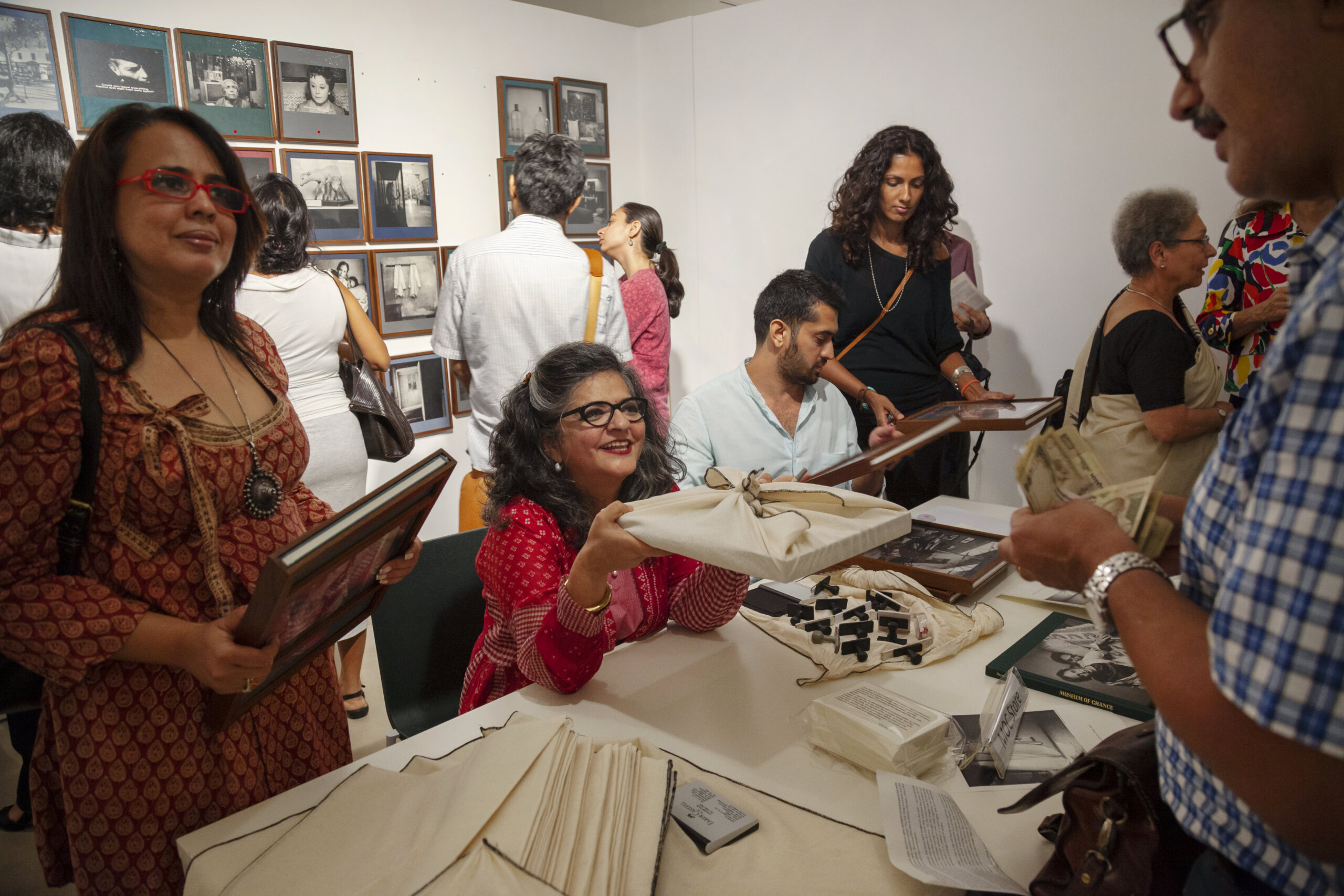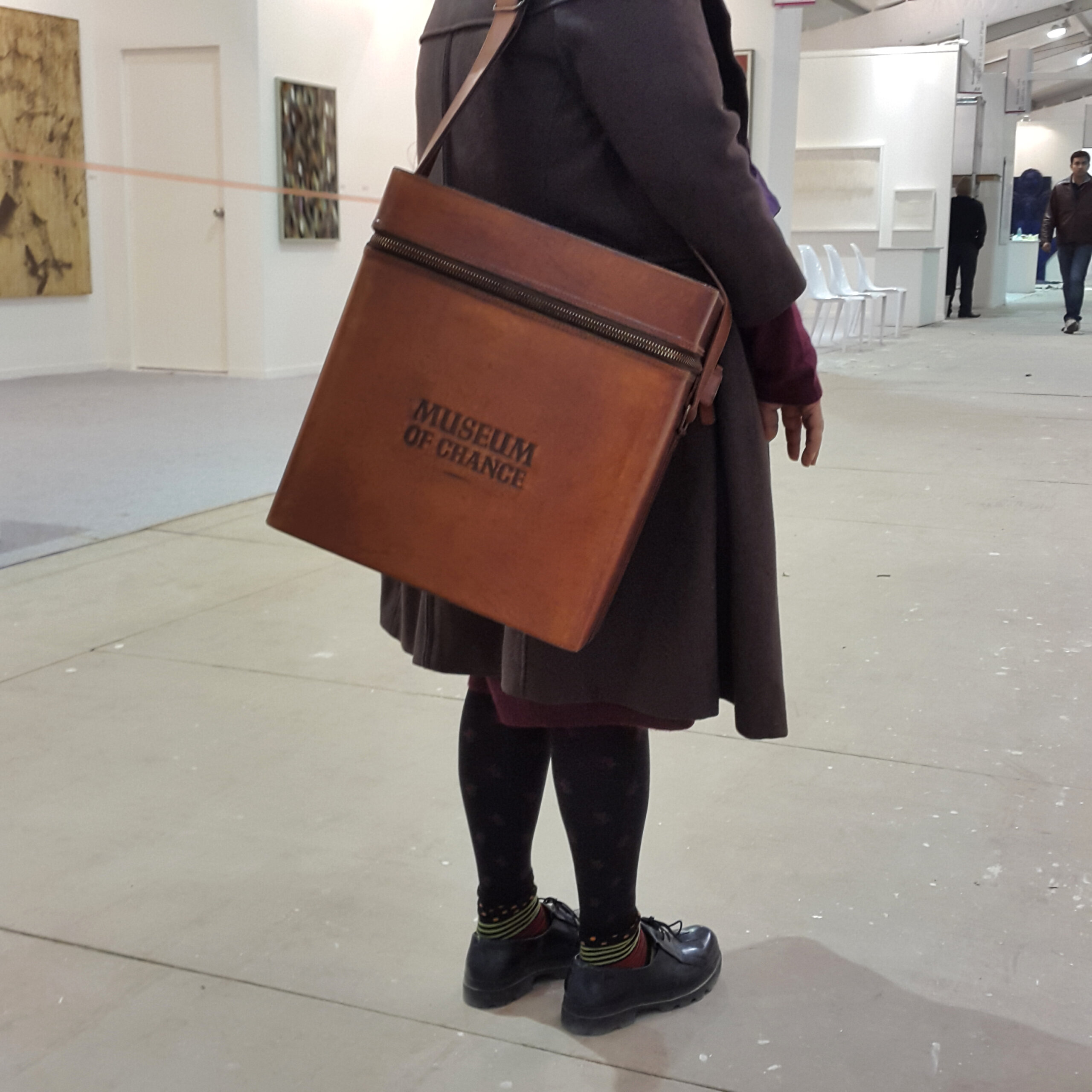 First, she sat across from the buyer, engaging them in conversation as she stamped and personalized the book-object of their choosing. Next, she wrapped and placed them into canvas and leather tote bags with a Museum of Chance design. At some events, she even designed the table and stools on which she would sit with the collector.