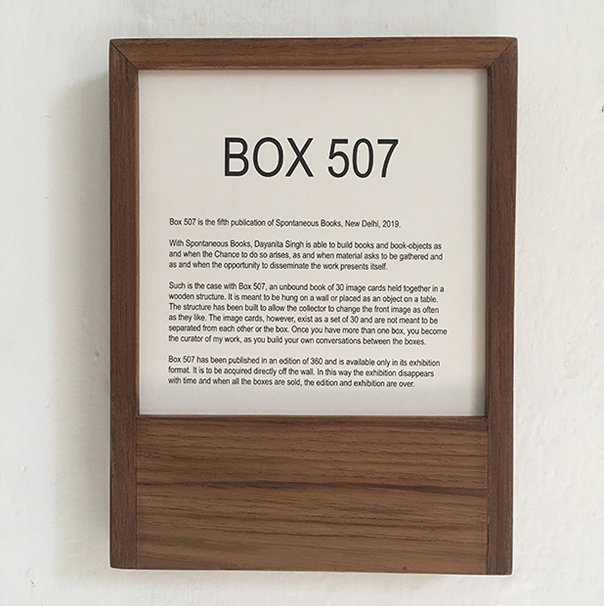 Box 507 has been published in an edition of 360 and is available only in its exhibition format. It is to be acquired directly off the wall. In this way the exhibition disappears with time and when all the boxes are sold, the edition and exhibition are over.