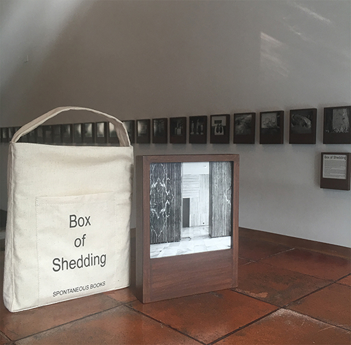 Box of Shedding has been published in an edition of 360 and is available only in its exhibition format. It is to be acquired directly off the wall. In this way the exhibition disappears with time and when all the boxes are sold, the edition and exhibition are over.