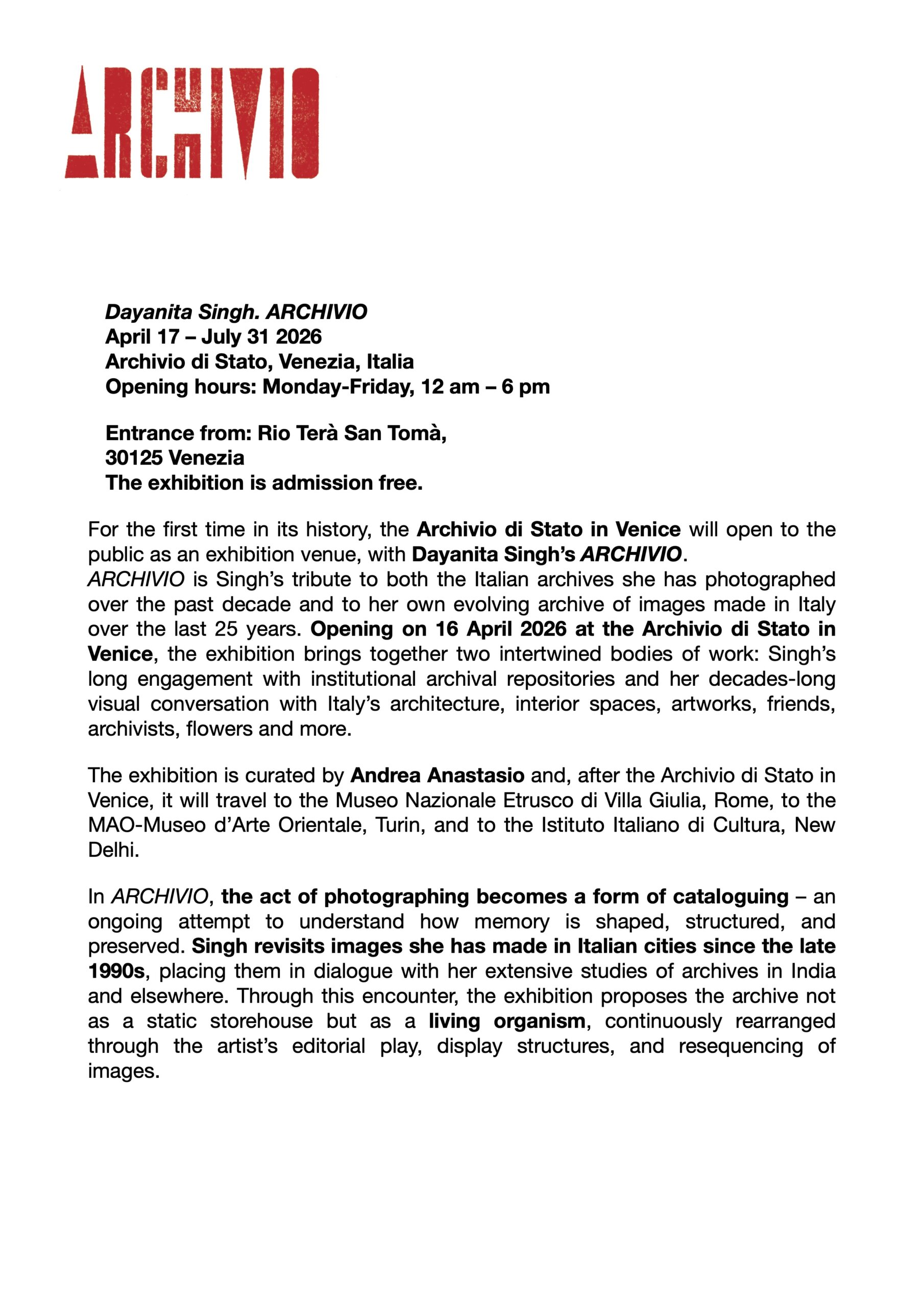 The exhibition is curated by Andrea Anastasio and, after the Archivio di Stato in Venice, it will travel to the Museo Nazionale Etrusco di Villa Giulia, Rome, to the MAO-Museo d’Arte Orientale, Turin, and to the Istituto Italiano di Cultura, New Delhi, presenting each time a site-specific works’ selection that connects to site, in collaboration with each Museum and its specificity.