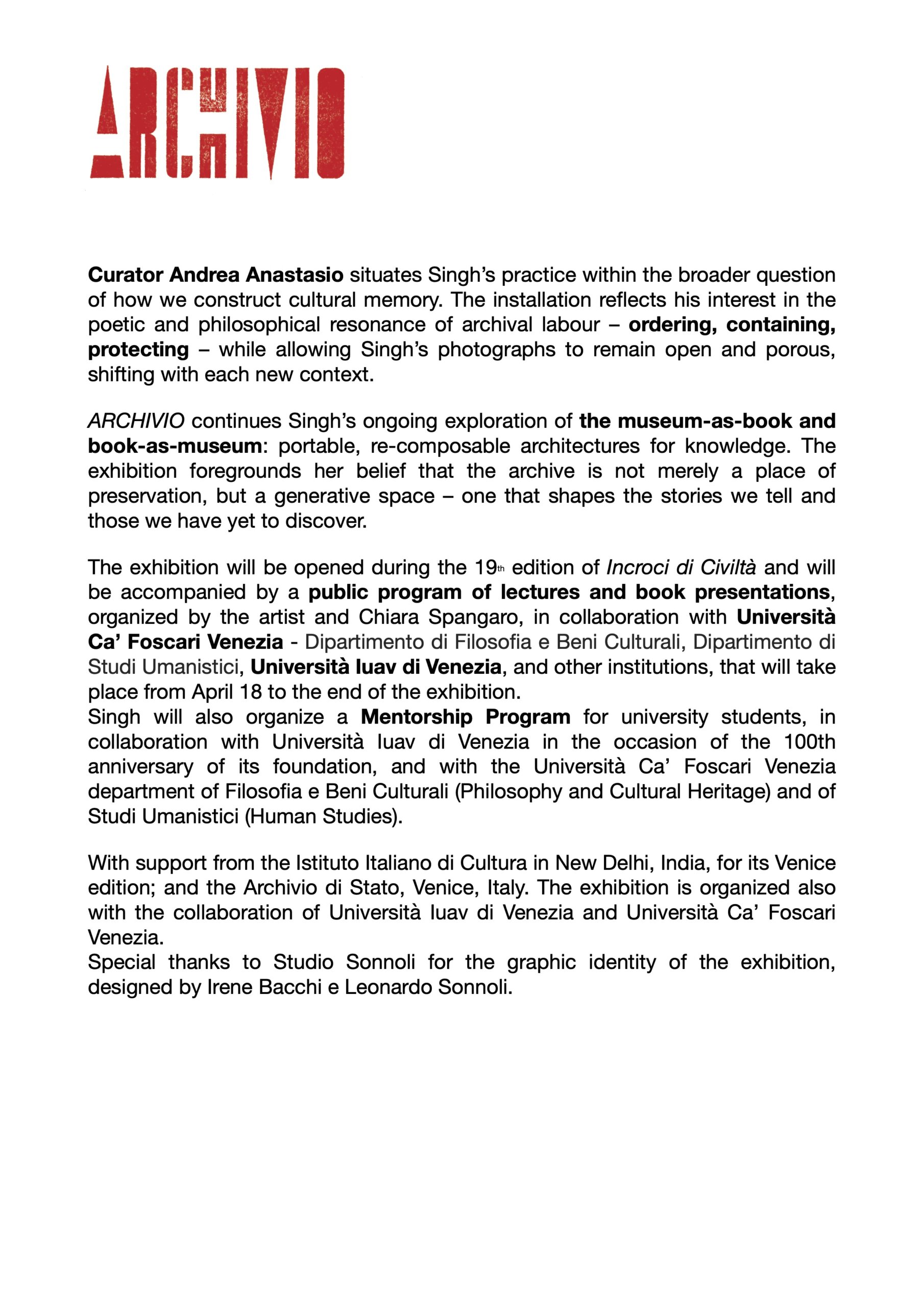 Singh will also organize a Mentorship Program for university students, in collaboration with Università Iuav di Venezia in the occasion of the 100th anniversary of its foundation, and with the Università Ca’ Foscari Venezia department of Filosofia e Beni Culturali (Philosophy and Cultural Heritage) and of Studi Umanistici (Human Studies).