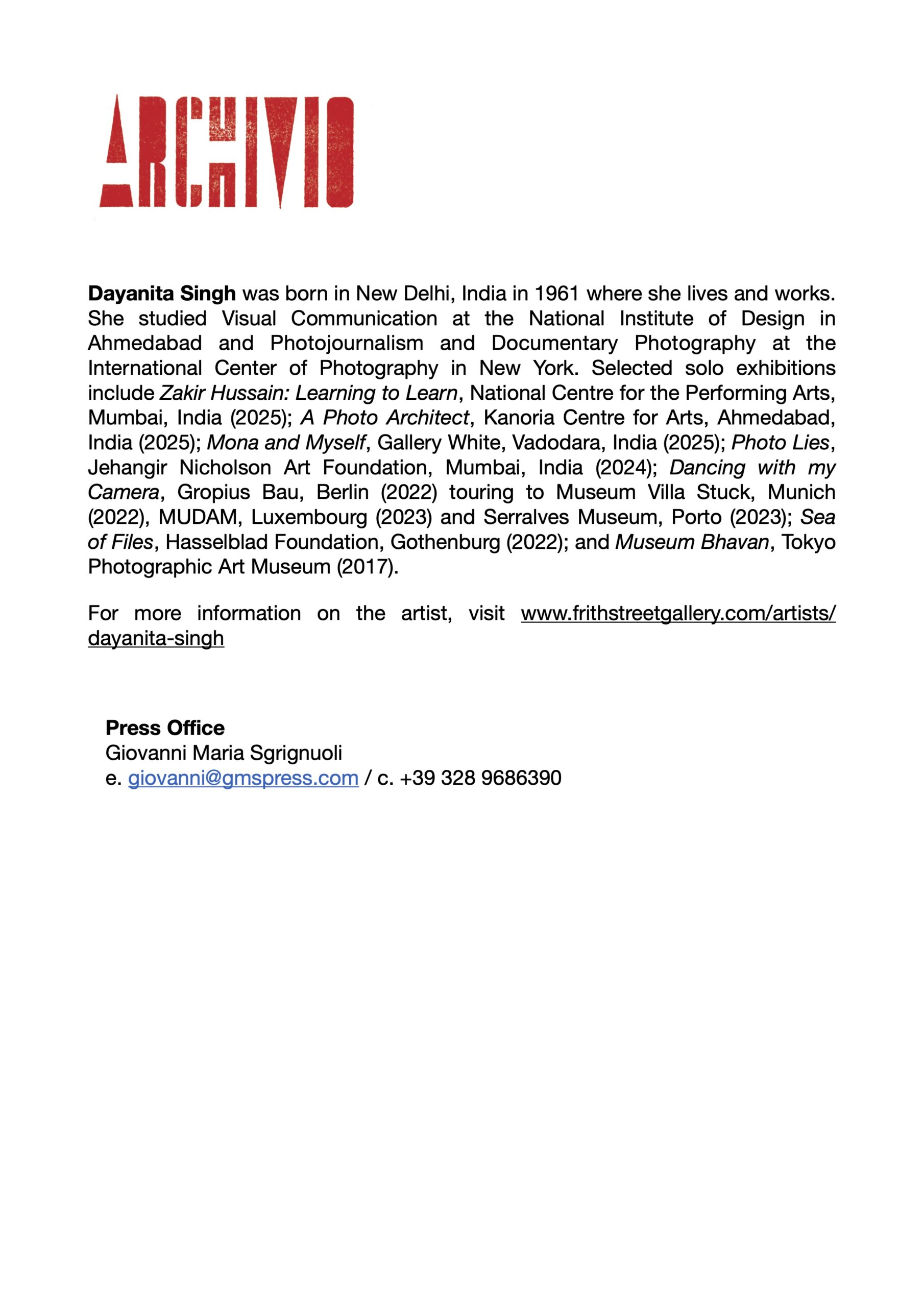Dayanita Singh was born in New Delhi, India in 1961 where she lives and works. She studied Visual Communication at the National Institute of Design in Ahmedabad and Photojournalism and Documentary Photography at the International Center of Photography in New York. Selected solo exhibitions include Zakir Hussain: Learning to Learn, National Centre for the Performing Arts, Mumbai, India (2025); A Photo Architect, Kanoria Centre for Arts, Ahmedabad, India (2025); Mona and Myself, Gallery White, Vadodara, India (2025); Photo Lies, Jehangir Nicholson Art Foundation, Mumbai, India (2024); Dancing with my Camera, Gropius Bau, Berlin (2022) touring to Museum Villa Stuck, Munich (2022), MUDAM, Luxembourg (2023) and Serralves Museum, Porto (2023); Sea of Files, Hasselblad Foundation, Gothenburg (2022); and Museum Bhavan, Tokyo Photographic Art Museum (2017).